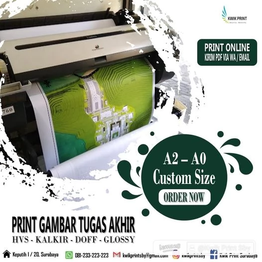 Kwikprint Surabaya melayani kebutuhan cetak semua dokumen penting anda. Termasuk ngeprint tugas akhir anda. Dengan menggunakan mesin plotter yang bisa mencetak dalam ukuran besar dan cepat sehingga kebutuhan cetak dokument anda bisa sesuai dengan pesanan, cepat bisa ditunggu dan dengan harga yang ramah kantong.
